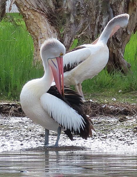Pelicans grooming themselves.