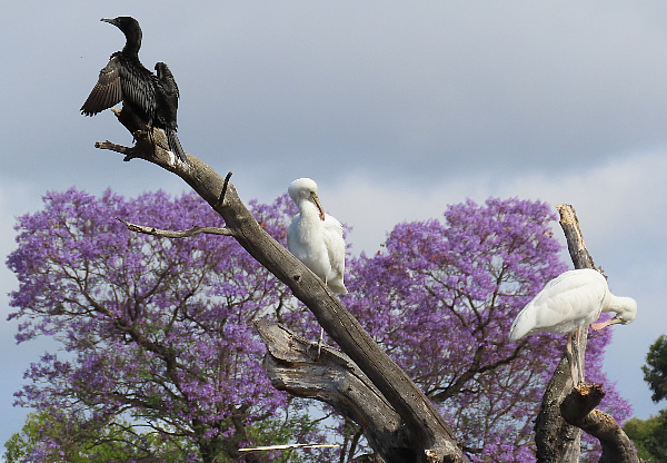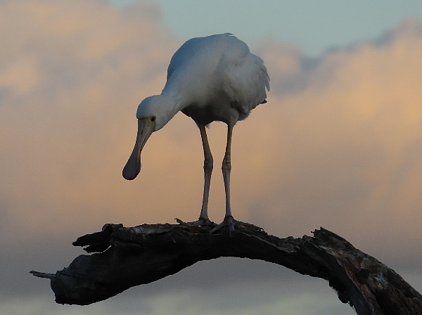 A young spoonbill crosses the river from his nest to explore another perch just before a storm.