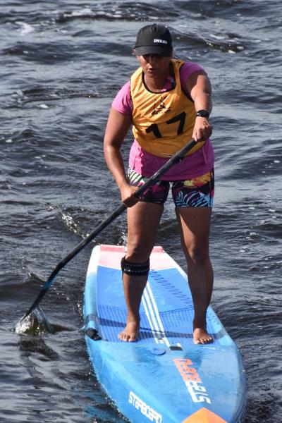 Nishani Jacob. Hard work on a SUP for over 14kms. Photo Lawrence Greed.
