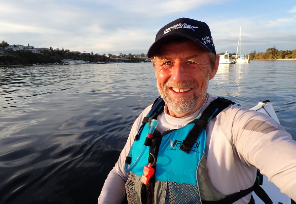 training. I arrived at Fremantle about 6.03am and I was on the water by 6.15am paddling with the current. The sun was out but 15 minutes later clouds dullened the day. About 700 metres before the spit I met Eddie Stoweider who had just finished training with his mate. I hadn’t seen Eddie for a long time so we had a lot to talk about. The sand bar was covered with water but it was