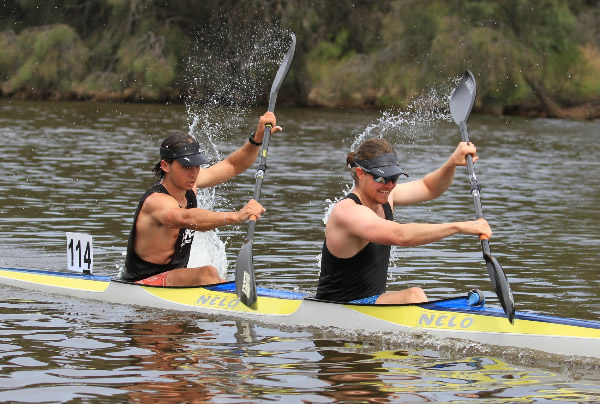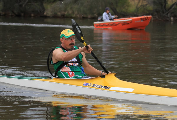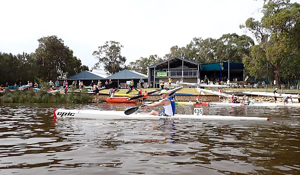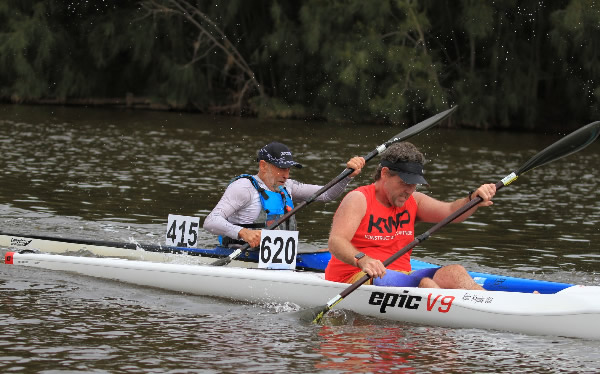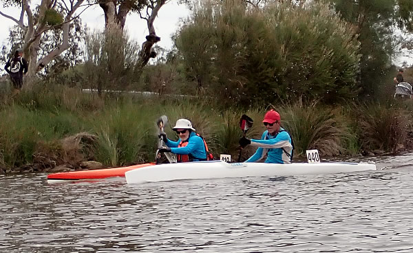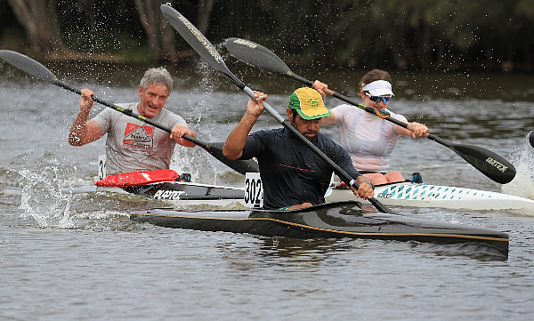 Hale. There was now only Chris in front and if he got tired and we paddled faster, which was hard to do, we just might catch him. As we paddled through the Ascot Waters area I glanced behind to see we were still 20 metres ahead of our competition so I was buoyed. Once we got back into deeper water upstream of Garrett Road Bridge I started putting a few bursts of speed on to allow Andy to wash ride me, but I never lasted long as he kept putting on a strong pace. We could see John Hilton from div 2 ahead and he wasn’t looking his best so we soon passed him. Unbeknown to me at the time