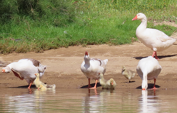 Five small goslings keep close.