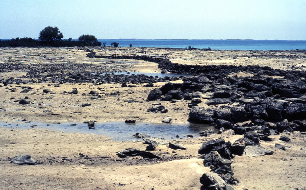 A fish trap at One Arm Point. When the tide comes in the fish swim over the stone wall and when it goes out some of those fish get trapped.