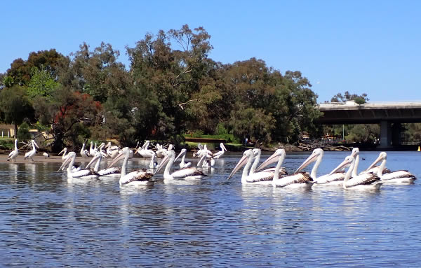 The meeting of 35 pelicans in Redcliffe.