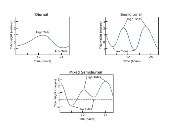 minutes. This is why the high and low tides do not occur at the same time each day.Types of Tides If the earth was completely covered in ocean, with no continents to block the movement of water, there would be two high tides and two low tides per lunar day. However, in the real world, continents block the movement of water, complicating the tidal patterns. Due to this interference, there are three types of ocean tides. These are diurnal, semi-diurnal and mixed tides.Semi-Diurnal and Mixed Tides Most tides are semi-diurnal or mixed.