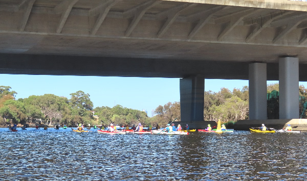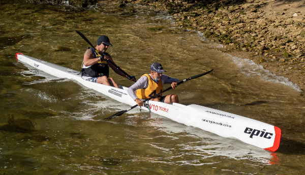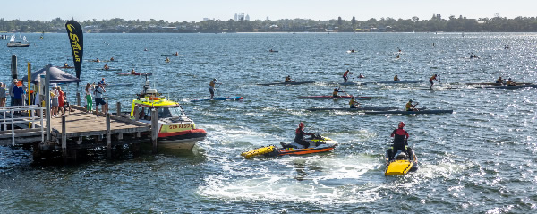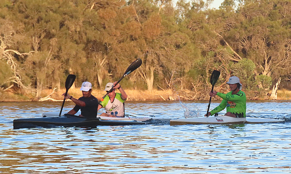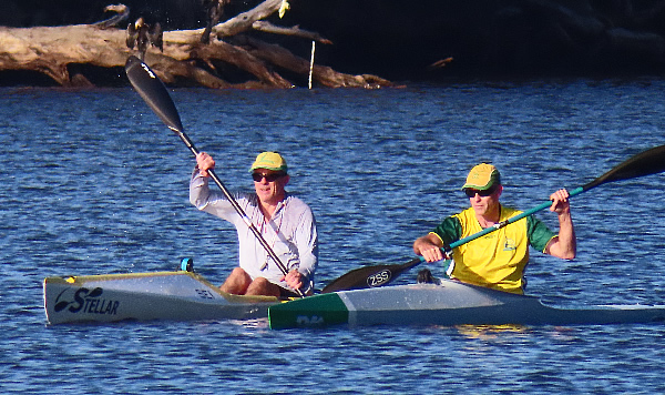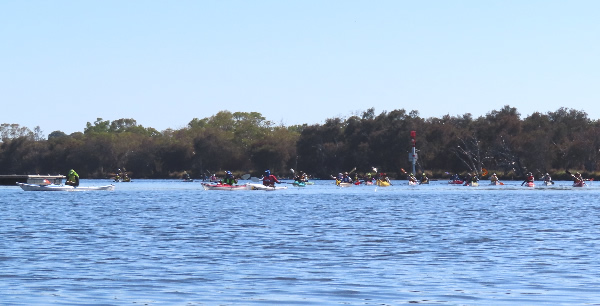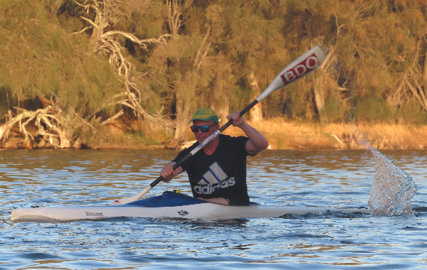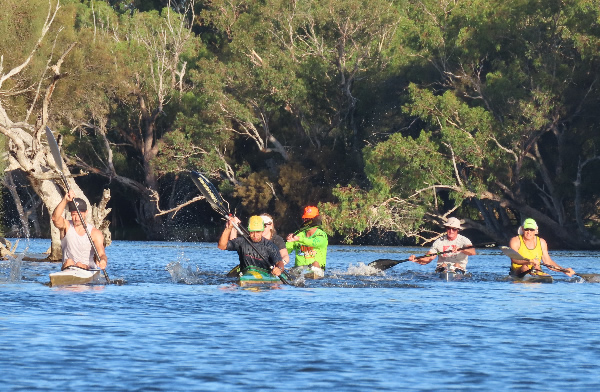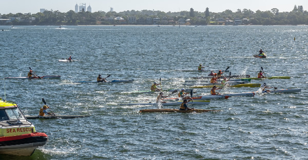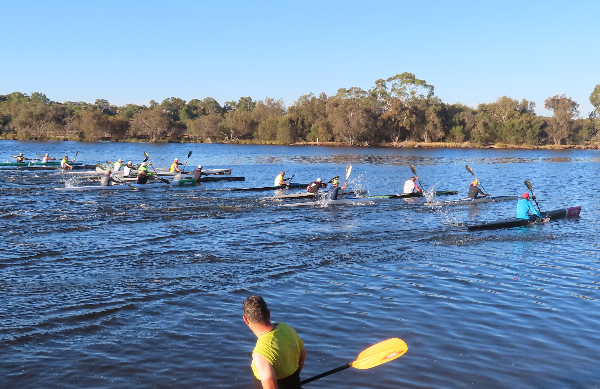 Rod Fry Race When we arrived at the Swan Canoe Club there was a stiff easterly wind blowing so it looked as if the first 1.4 km part of our race, with the conditions being a little rough was going to be interesting. I was paddling a double Epic ski with Chris Watson. We were very close to being the same speed in singles but we hadn’t paddled together for a few years and that was in the WA Marathon Champs with less bounce in the water. I didn’t expect that we would be falling in, but paddling across the waves as we warmed up had us stuttering for a while. There were only two paddlers that braved it in narrow K1s, John Hilton and Andrew Hewlett. The rest of the field were either in skis, outriggers, SUPs or sea kayaks. Jaime Roberts introduced me to a young guy called Lewis Smith who was visiting Perth from the city of Lincoln in England. Having been brought up on a farm in Lincolnshire we had a little in common. He was in Perth for 2-3 weeks and it was his first race in Australia.