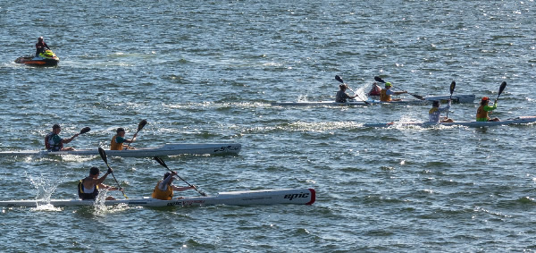 to be a few hundred metres behind which took the pressure off us a little, but we really couldn’t let up as there were still some big power boat waves coming through. A lack of concentration and a capsize would be disastrous. A race is never over until the finish line is crossed. After Chidley Point we