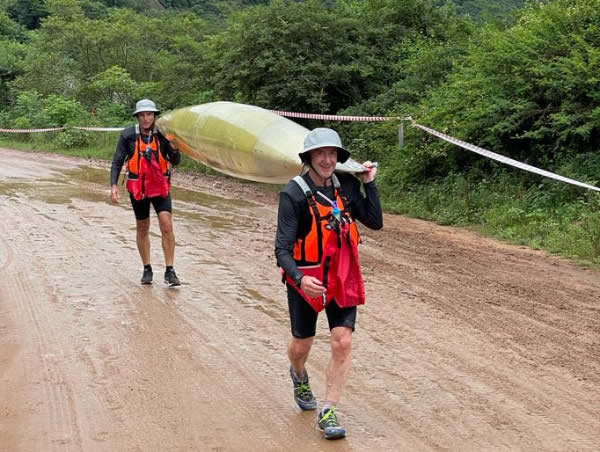 portages and kept making a few minutes, but it was so hard as the usual lines did not exist and we went blind into so many rapids. Gordon did a superb job of keeping the boat up as I smashed into the stoppers and literally disappeared. Finally, we hit mango rapids and as the last major one it delivered some bruising rock hits to the hull, but the seams held and we were now on the 14 km haul to the finish. We dug deep and pushed on and were never so glad as to see the finish line. Even after all