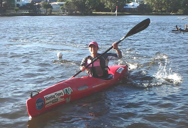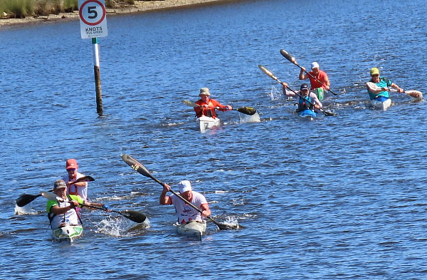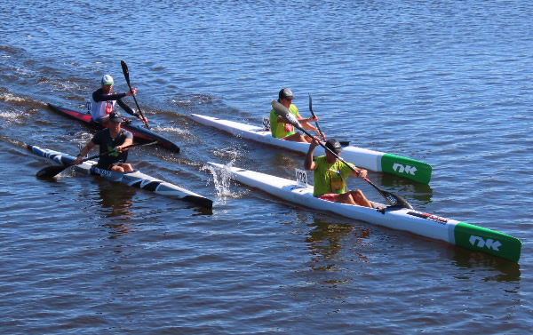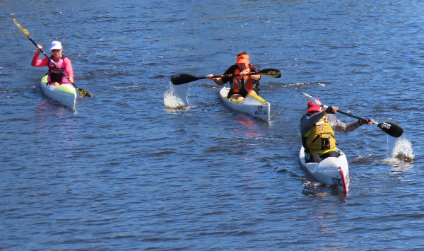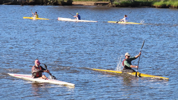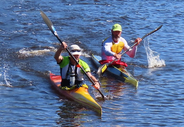 start. With the wind waves for the first kilometre, and areas of shallow water later it can be a tough race and probably not my favourite, but it’s a race and no matter how tough it is, it has to be done. As we gathered around for briefing and the start, the wind built up which made it more of a concern for the less experienced kayakers rather than the ski paddlers. Last year on this first open section the ski paddlers left me behind and I had to do some catching up and I imagined it would happen again this year. But I was wrong. As soon as div 3 was off a pack of ski paddlers formed over to my left and they seemed to be getting away, but as I got closer to Mt Henry Bridge I started to catch up and I eventually led into the cove and around the turn buoy. As I turned to go out of the cove my opposition, Paul Waters and Simon O’Sullivan came up either side of me which was a pain as I thought I had got rid of them. As we left the cove we started to bog down in the shallows, I skirted a patch of weed which I imagine Paul might have collected some of it on his rudder as after that I didn’t see him for a while. At this point I accelerated and managed to get in front of Simon and I didn’t see him again, although for the next few kilometres I had no idea how far Simon, Paul, or Erica were behind. Then some of the div 2 and div 1 paddlers started passing. When we reached the area where a line of wooden posts are in the water Grant