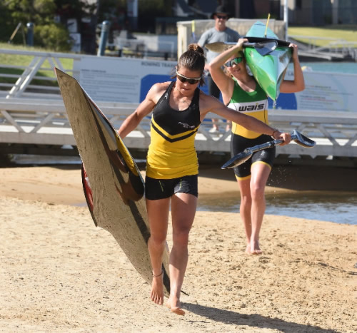 Sprint paddlers portaging.