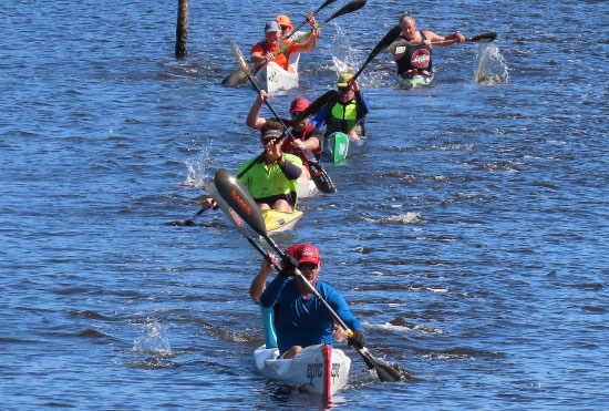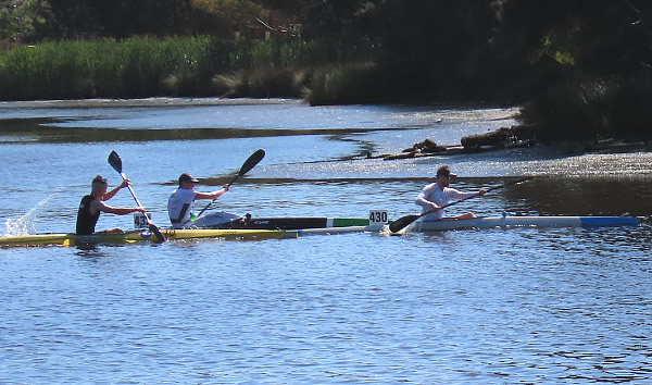 them. So four hundred metres from the finish line the 1st place that I was hoping to get in div 3 suddenly dropped to second place. No matter what I did in thoses last few hundred metres Paul was just too fast and too far ahead. Erica, who is as strong as an ox came in third. It was another good tough race and to warm down I paddled back upstream to escort the last paddler home and completing 24kms for the morning. It was thanks to John Hilton, Doug Hodson and the many volunteers who managed the
