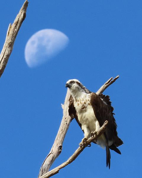 The wind and tree branches didn't quite allow me to get the Osprey in line with the moon but I was close.