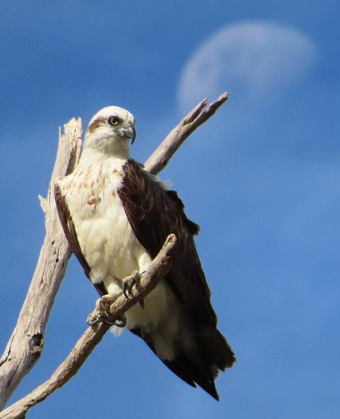 Looking up to the Osprey from under the tree branches and trying to get the moon in the picture.