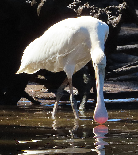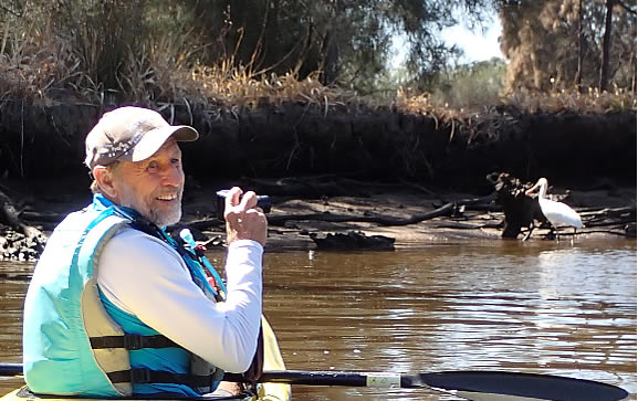 wide world. Where we put in was only 160 metres from Ron Courtney Island and within 200 metres a young spoonbill was scooping a meal with its bill on the mainland west side of the river. Then an adult and the other young spoonbill started circling overhead. It was like they knew we were