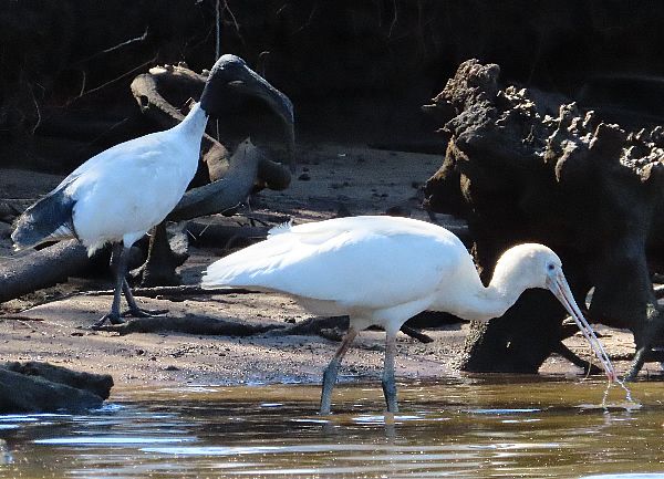 A young spoonbill and an ibis search for food.