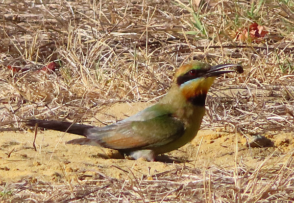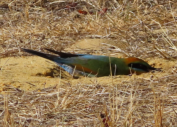 Bee-eaters catch insects on the wing and if its a bee it rubs or hits it against a branch to remove the sting before eating