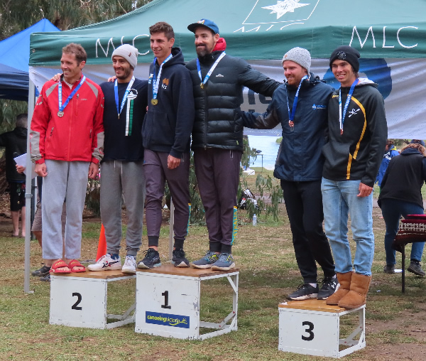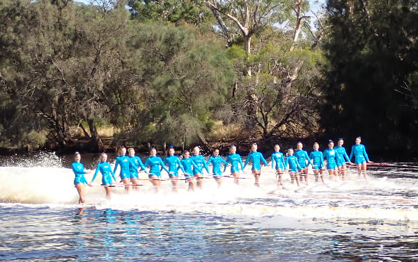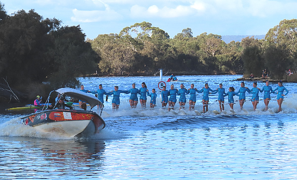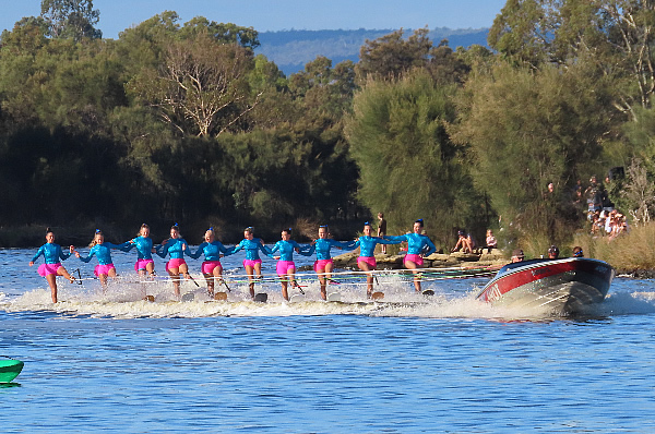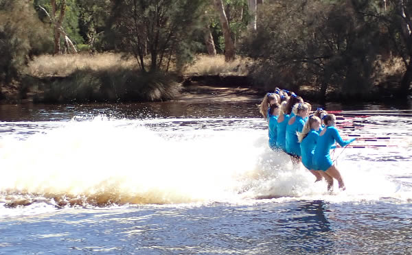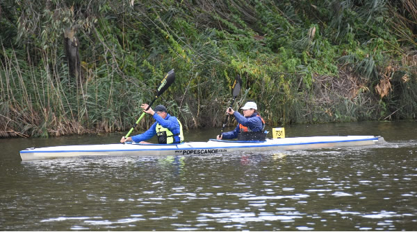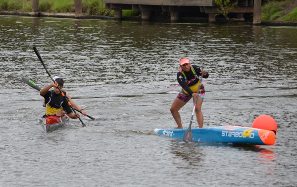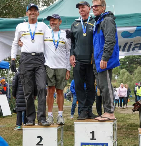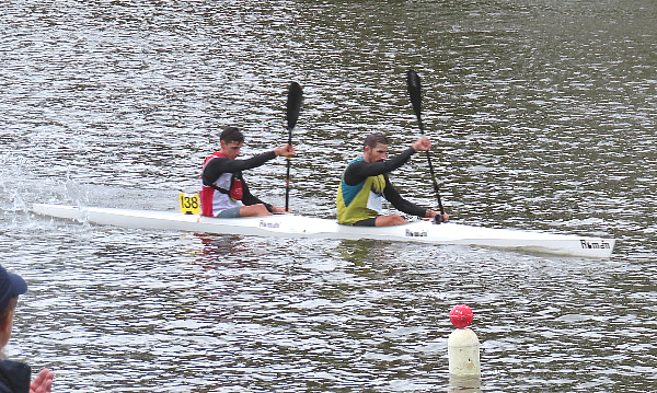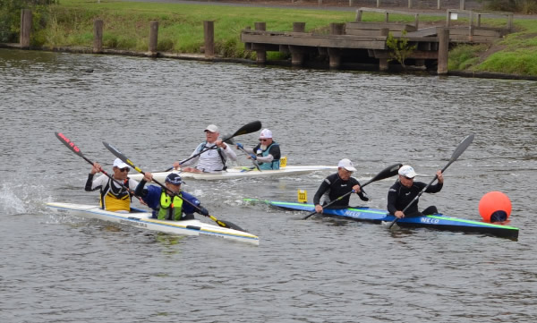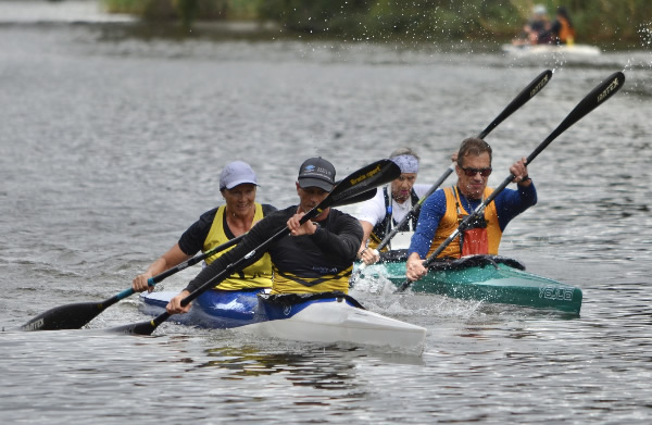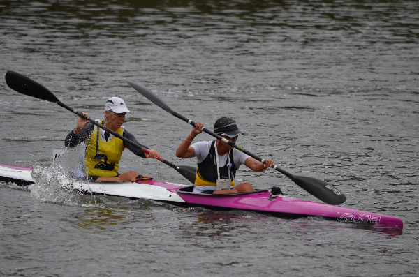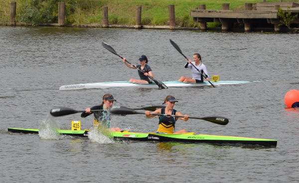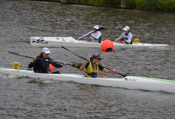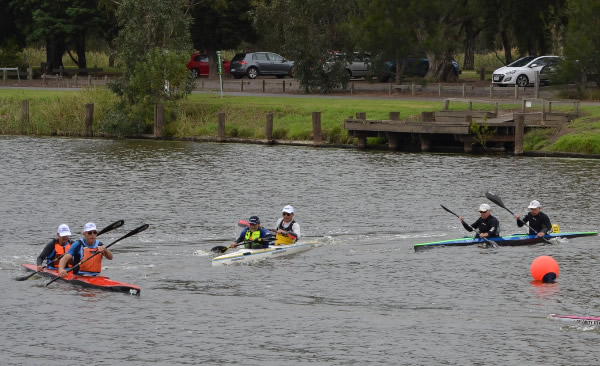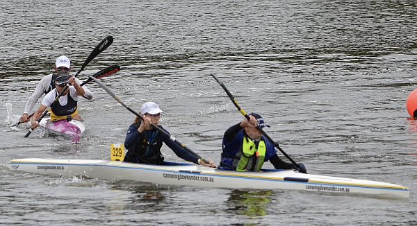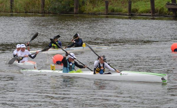 corner pretty okay and started heading back when I thought Marie said her shoulder was a little sore. Oh dear how hard do we push now! Then about 500 metres further I saw a nose of a ski coming along side. I had a quick sly check and, Oh No, it was Jane Liddle and Jeff Hosnell (NSW) on a ski. We can't let them pass I thought, we would never live it down and Jane would be reminding me back in WA how she beat us. The trouble was they were slightly quicker, and we could do little than to