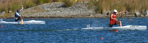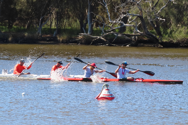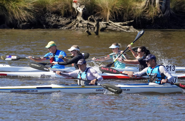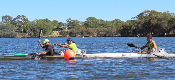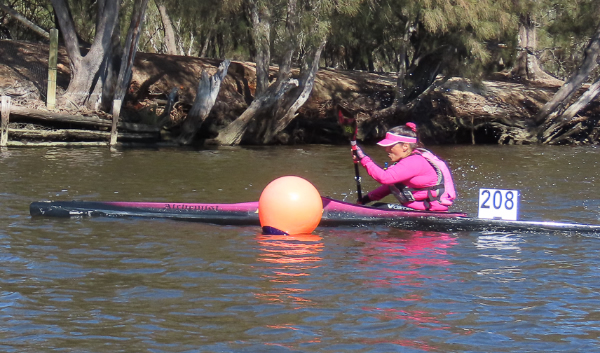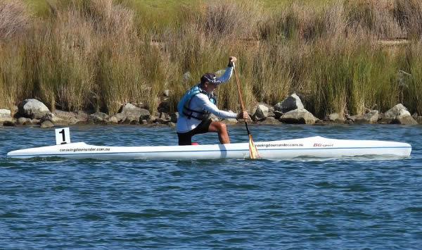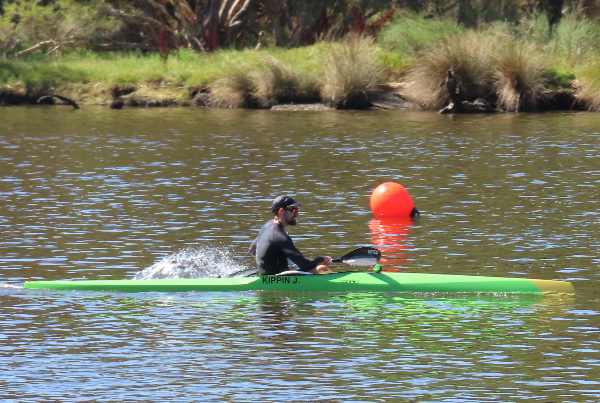 turn buoys we were side by side but although I put the pressure on I couldn’t lose him. At the Australian Masters Championships last year we were neck and neck throughout the race with me pipping him at the line, but he was in his ski then. I have always beaten him in races when he has paddled a kayak, but now I was worried having him next to me. I could only hope he will fade as the race goes on. (Many paddlers are much faster on skis because they don’t have to worry about balance, but once they get in a kayak I tend to have a better chance of beating them.) After doing three turns, about 5kms