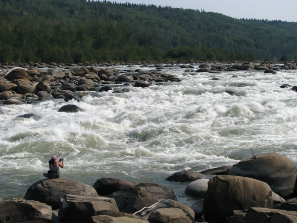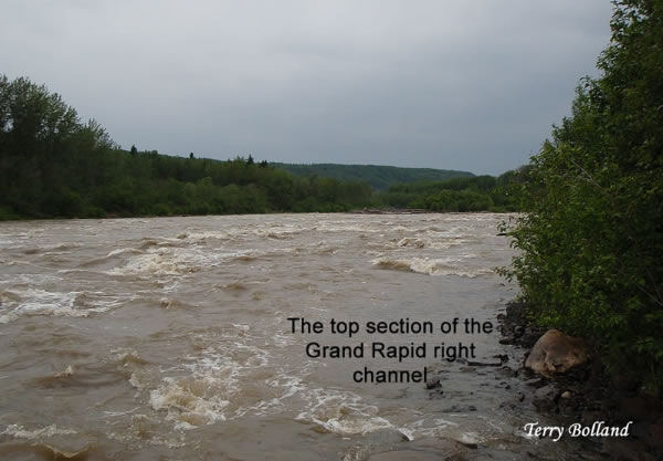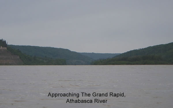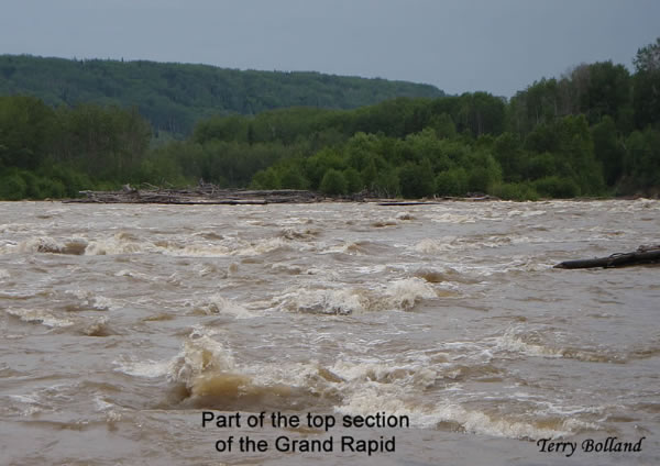 recent photos of canoeists tackling the grade 4, 5 & 6 rapids on Athabasca River or find any of the big Grand Rapid itself apart from a few historic ones, so we were about to run the Grand Rapid blind. Even Google Earth only had blurred images, so they weren’t of any great assistance to us at all. From a kilometre away the
