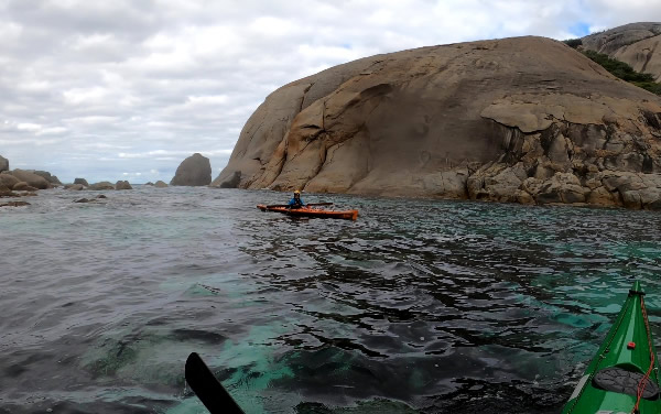 a perfect break-in (turn) into the eddy which I was very proud of. We had taken it easy and at no time were we under any threat of losing control of the canoe. We cut into the eddy ensuring the bow was pointing upstream which gave us more control. The elation and relief of being safe was very satisfying. All we had to do now was to line the canoe around a rock shelf that jutted out from the shoreline into the river for about 6 metres. With throw lines attached to both