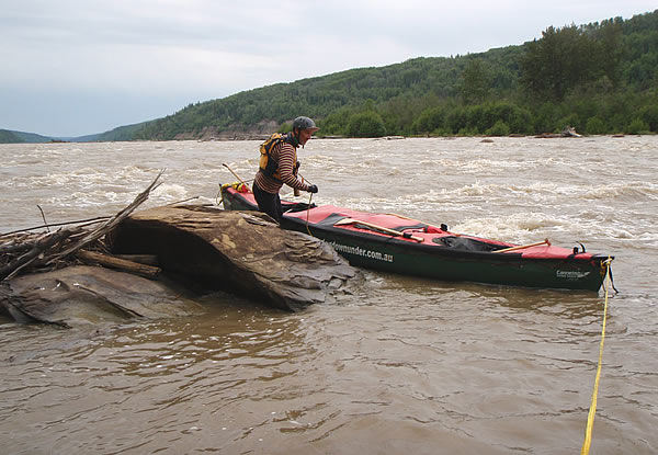 everything. Logs stranded on rock shelves and rock boulders protruding from the shore forced us to paddle away from the bank and into the faster currents where we skirted some of the drops and paddled over others. The rapids were not too difficult, but it was what could happen if we capsized that made the attempt that much more dangerous. When we reached our get-out eddy we performed