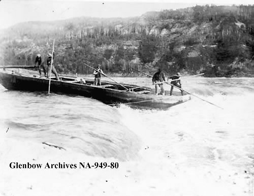 A scow boat poling up the rapids. They came back up the rapid as well as going down. The men often had to pull the boats back up the rapids.
