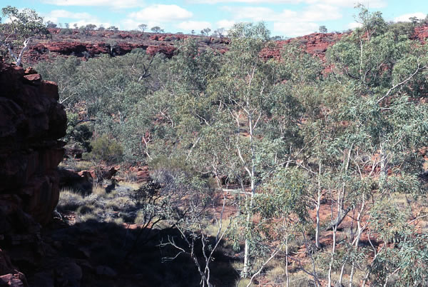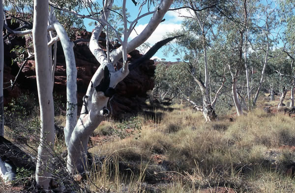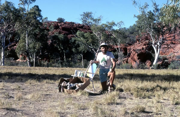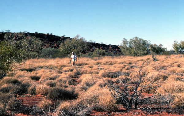 passed. I soon neared the cliffs and hills and at the top of a corner cliff on the south western spur, a stone cairn was piled high like a giant cone looking over the semi-desolate country. It was a monument two metres high, built by Canning in 1906 and impossible to miss. I walked on over a stony area towards Biella Gorge turn off, 7 kms away. Here I accepted a detour ride with Tim and John into the gorge for lunch. The creek was lined by super white ghost gums that glowed before the ochre cliffs. We took a walk to check out the dried-up stream bed and the rock paintings in the gorge. We returned to the turn off and I started walking again. I met people in three cars, one from the Hunter Valley Canoe Club. We talked for a short time about the club and about Ian Gardner, a very good Down River paddler that I had known.