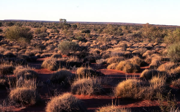 engulfed the red glow, spreading mackerel red shades across the sky. It was one of the finest mornings to walk. I soon passed the turn off to Well 16. John and Tim checked it and found foul water. I walked over the first sand dune with ragged stumps of spinifex and followed the huge hoof marks of a camel. The tracks were fresh but again I didn’t set eyes on the beast. It was the best time of the day to walk; cool, still and colourful. John and Tim caught me up after 90 minutes walking alone. The roar of the engine shattered my peace and thoughts of the past. Durba Hills loomed in the distance, getting closer every minute. I looked forward to our arrival there. Five vehicles from Victoria passed me. I was alone walking a narrow track in the desert miles from nowhere yet two vehicles passed without a even a word when they