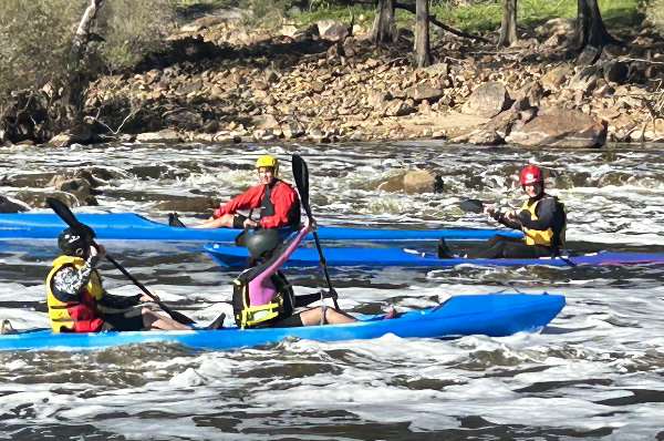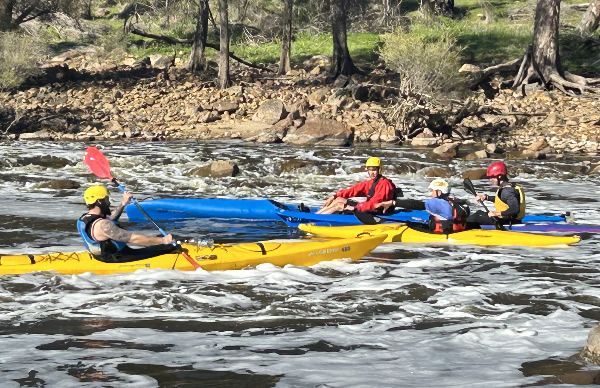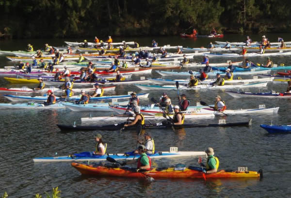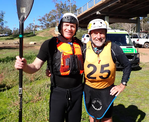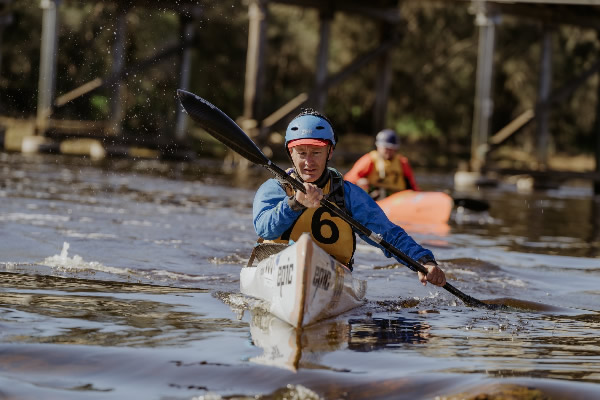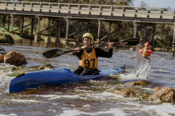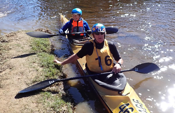 ladies, the short plastics, the wild water kayaks and Wavehoppers and a few strays. There were 25 or more on our grid and although Warren who gave the briefing said we should go down the Northam weir in a nice orderly fashion, I don’t think that was on the mind of many seasoned racers, as most wanted to get there ahead of others to get a clearer run of it. One boat going sideways on the weir turns the slide drop into amusing crash scene and can cause several minutes delay. When the hooter sounded about 6 paddlers took off with conviction including me, although I wasn’t ahead, but I kept a good speed and arrived at the weir 4th with Bronwyn Martin taking off to portage and Stephen Coward and the double of Melissa and Derek Klompmaker paddled the weir. They both paddled over it