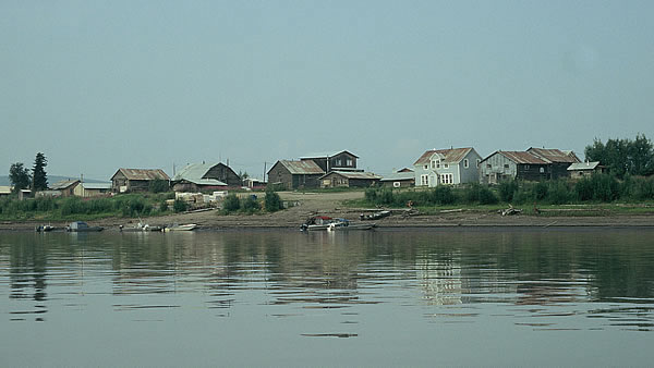 the channel that led into the village of Marshall. We decided not to visit the village as it was well out of our way plus the fact that we would have to paddle down a long slough (a channel), with little current when leaving the town. We found an island sandbar to camp on in sight of the village, and walked along the bar trying to