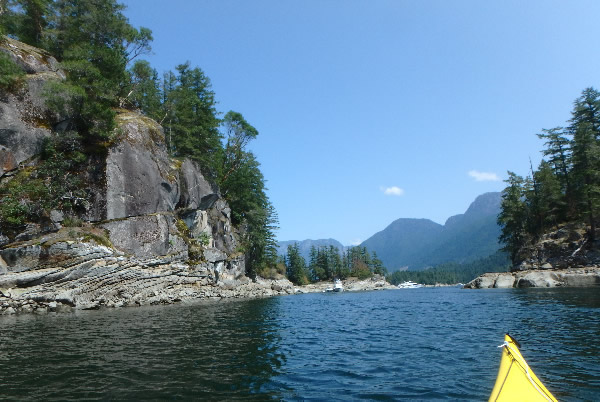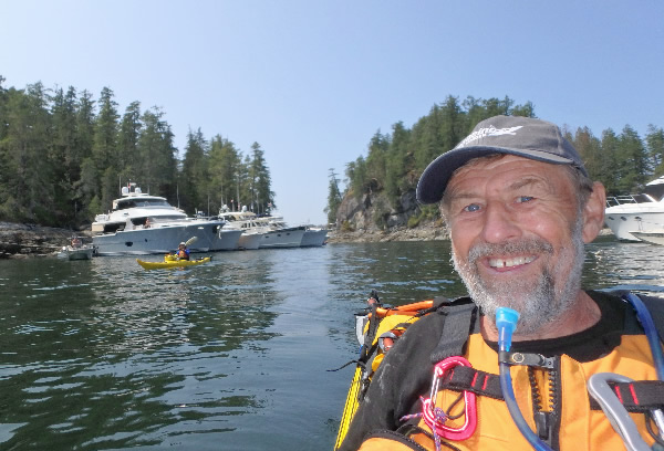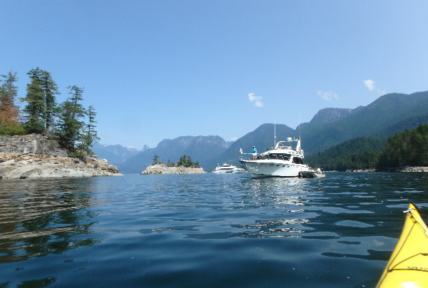 nestled between islands, we came across several million dollar boats and yachts that were anchored. The area looked as if it was a playground for the rich or at least people richer than we were. There were also float planes arriving and taking off bringing people who must have been renting a berth on a boat. With the water in this area said to be the warmest water along the coast people were taking advantage by swimming, paddling on small sit-on-kayaks, or paddling