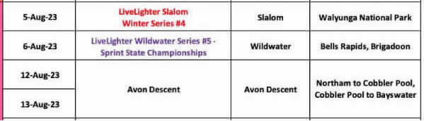 Saturday 5th August Bells Rapid to Middle Swan Powerboat Practise Sunday 6th August Northam Weir to Posselts Ford