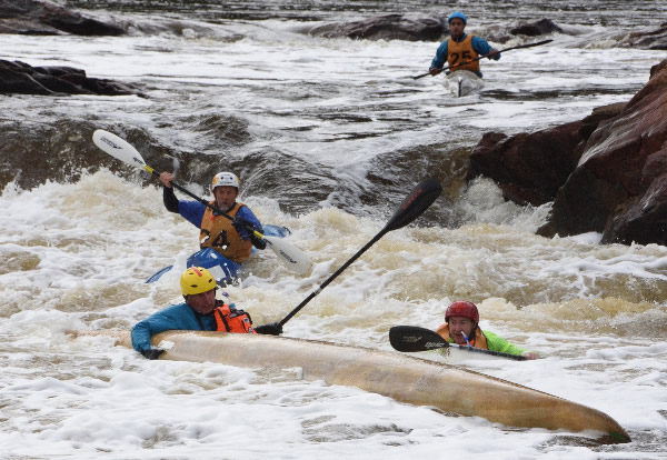 to cut across to the right as I went down and be in the right position for the next part of the rapid. (Many paddlers follow the water current down the drop and then realise that they can’t make the right hand turn and get swept into the big eddy on the left and have to turn around and ferry glide back over to the right. If this happens you can lose many minutes.) Luckily for me I managed to avoid Joe and Gordon who had capsize down the drop and make my way to the right and into the next rapid before Devil’s Slide. The approach to Devil’s Slide can be tricky as eddy currents tend to hide behind rocks just upstream and tend