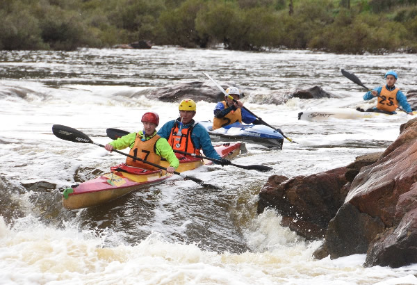 was in a Wild Water Kayak or Peter Gigengack, who was in a K1 passing me. They had started one or two minutes behind me so I had no chance of beating them. When they did pass me about 1km after the S Bend, where the trees get more interesting I just couldn’t let them storm ahead so I joined the conga-line which consisted of Connor, Phil, Peter and me. At a good speed we meandered like a snake down the river ducking and swerving around the trees, and paddling through shallows that dragged us down. It wasn’t easy to keep up with them and many times I