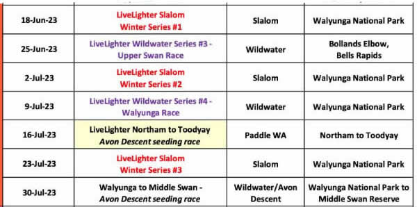 Slalom Race 1 This weekend Welcome to Winter Series Race 1 - Brevis Choate Memorial Race Sunday the 18th June, 2023 at Walyunga National Park. Setup and registration from 8:00am, Racing starts at 8:30am If you are a member of a Kayak Club or PWA Direct Member then the Race Fee is $10 or take advantage of the Season Rego for $60. Pay on the day or direct debit to Paddle WA (please make sure that you add .07 cents (either $10.07 or $60.07) to help PWA recognise this as a slalom race payment. if not, you can join here https://paddle.org.au/membership-information/#directprocess We need all participants of this race to be members of PA either through a club or direct to ensure that you are insured. Helmets and PFDs are compulsory. Look forward to seeing everyone for the first race of the winter season! the WA Slalom calendar. Enter here:-