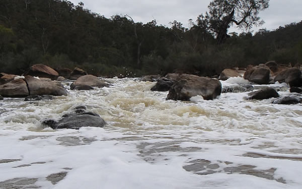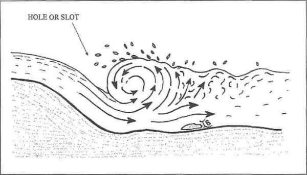 A Stopper. 'Stoppers'are caused by water gushing steeply over a ledge, weir or large rocks. The fast moving water which tumbles over the obstruction, starts to recirculate once it hits the bottom. As the foaming water rolls back upstream, it forms a 'stopper' which