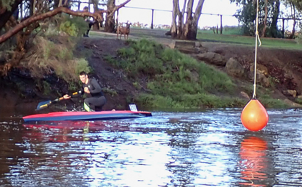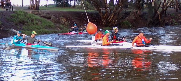 and kept close to the banks to avoid the faster currents. My rudder wasn’t that long and it was tough and I knew that if I did hit a branch it was strong enough to take a big hit as for some of the other paddlers paddling skis their rudders were generally longer and more fragile, so they had to be a lot more careful. This gave me an advantage allowing me to keep so close to the bank that I had a slower current to fight against, which helped me get away from the pack. I glanced behind occasionally and although I did see a figure several metres behind I didn’t see it as a threat heading upstream. The 5km section against the current was always a drag, but today it was quite fun, although I was dying to meet the faster paddlers heading back from the turn-around-buoy at Maali Bridge, so I knew the turn