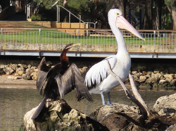 A Darter and Pelican waiting for the Swan Cafe to open. The