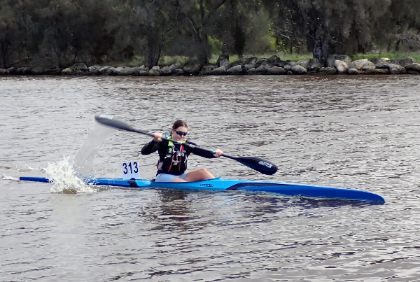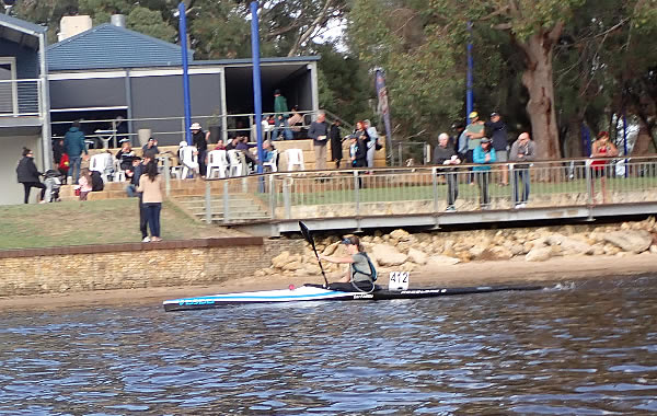 Lily was still strong, but at 15 kms mark she faded a little. After paddling under Barkers Bridge, West Swan Road Lily slowed considerably. I thought she might be getting a drink. I slowed right down to allow her to get back on my wash, she did for a few minutes, but slowed again. In the last long race she got so uncomfortable in her boat that she dropped back and I had thoughts that she was having seating trouble again. I slowed again, but I could see she wasn’t fighting to get back to me, so I