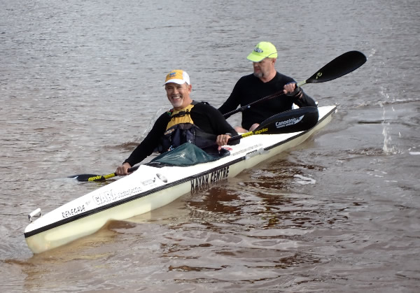 although the current was against us, the waves were with us giving us a much better paddle to the finish line. Soon after the bridge I started to move away from Tim and within 500 metres of the finish he was well behind which was a mystery. I was expecting a duel to the end with Tim taking first place, but I was