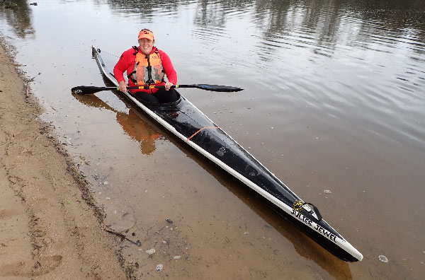 and done no paddling. He also had a shoulder injury. I managed to pass both boats just after Guildford Bridge and by now that figure behind me had caught up and was on my rear wash. It wasn’t until we were 700 metres from Sandy Beach that Tim Cornish showed himself and drew beside me. I was relieved it was Tim as he