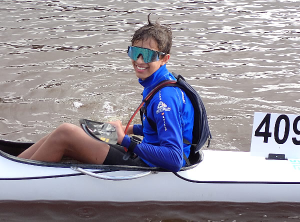 doing a 13km short course that went downstream to Ascot. There were also 6 SUP paddlers taking part in the 13km race. The weather was mixed. Although the rain had stopped the wind was active. When we were off a frenzied line of paddlers splashed their way down the river. I was amongst the first 5 or 6 in div 3. The sprinters like young Lily Farrell, Sara Major, Simon O’Sullivan, Stephen Coward managing to get a boat lengths ahead of me for a while but by 800 metres, just before the first right hand bend and when the others were tiring I made my move and took the lead. Just around the corner there were branches