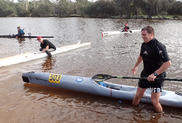is a much faster paddler than me so I didn't feel as bad. The wind had been howling and on this section it was much worse. I allowed him to take the lead and a kilometre or so later I took the lead back. When we rounded Ron Courtney Island the wind really picked up making the 1.7km paddle to the downstream turn the most energy sapping part of the race. It was really bad under Tonkin Highway Bridge with the wind extreme and the waves rebounding off the bridge pylons. Tim was first to the spit post turn which was the most difficult turn as fairly big waves moved up the river. We were both careful but turned without mishap and I took the lead back as we headed towards Ascot Kayak Club. Other years this last 1.9 km section of river is usually the hardest as the wind is usually in our face. This year,