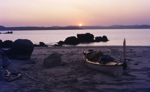 I sneaked a sip of water before trying to sleep, but the water from my still tasted like aluminum. At the start of the new day I was wondering what things were in store for me. I had been bothered by mosquitoes all night and now I was being attacked by sandflies as I walked my kayak and gear down to the beach in the hazy morning light. I decided to
