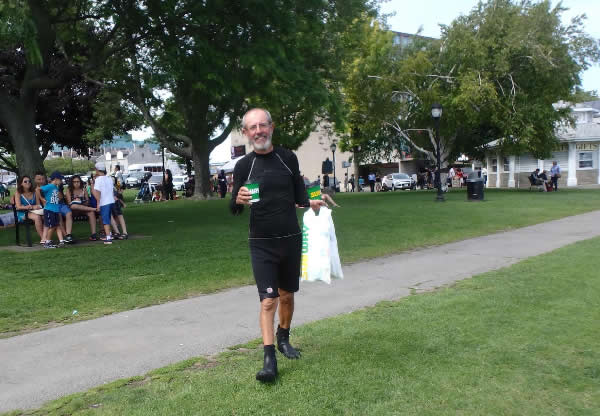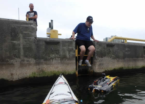 John bringing a subway lunch. John walked across the busy square in his booties and baggy shorts, then I saw him walk along the footpath in the search for food. When John was hungry nothing would stop him finding food. He had that walk of determination and would have mowed down the biggest Canadian if they got in the way. He returned later with a foot-long Subway, cake and coffee. I didn't complain, we needed a treat as we started paddling at 6.10am to ensure we would have time to stop at