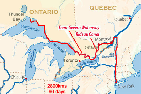 Kingston and get to the first lock on the Rideau Canal 49kms away. After eating lunch in the busy park we paddled away from the activity rescuing a remote controlled speed boat after it had gone out of range of its owner. Here at Kingston we have a three way choice to get to New York. We could take a short cut by paddling a few days on Lake Ontario and getting into the Eerie Canal which cuts off miles, but by doing that we would miss out a lot of country. Or we could have gone down the St Lawrence Seaway straight to Montreal but the big