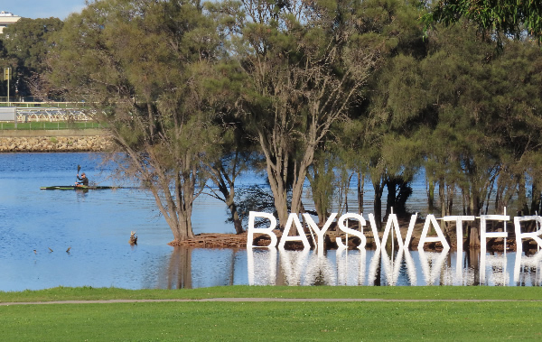 Paul Dymock paddles by the Bayswater sign Monday morning after the Avon Descent.