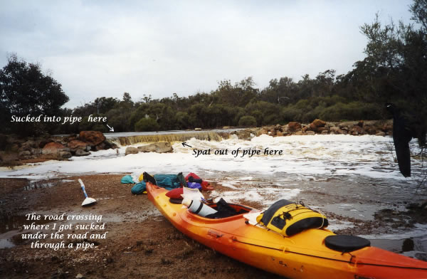 here I was sucked out of my kayak so quickly I had no time to re-act. The suction pull of the water was amazingly powerful. There was no way to fight it and luckily none of my clothing got caught, which would have been certain disaster. I was like a crumb being sucked down a plug hole.