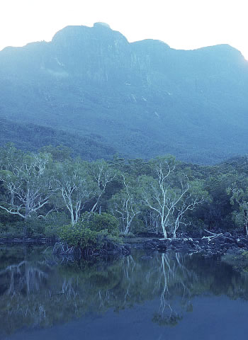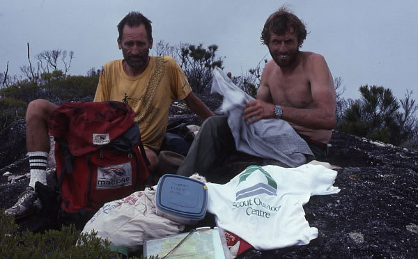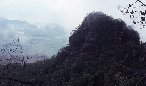 ridge through burnt banksia. Our clothes, hands and face became black and the sweat ran down our faces, leaving grey streaks. By noon we reached a peak with several boulders that we incorrectly estimated to be the summit but it turned out to be a false summit. With the cloud surrounding us, visibility was down to the minimum but at times it cleared enough to get glimpses of the Hinchinbrook Channel and the mangroves. We moved on a little further and found the summit nearby where we had lunch