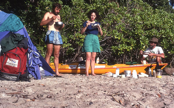 my kayak up the beach and was surprised to see Peter Jess and his girl-friend under the bushes. I’d met Peter on his motor bike near Elliot Falls, Cape York. Soon after, Dennis, (another English tourist) arrived looking absolutely shattered. He had accidentally climbed Nina Peak carrying his full pack, mistaking it for the main track along the island. When he’d met two other English people on the top with day packs on, he couldn’t believe what he had done. An hour later, Jenny and Tim